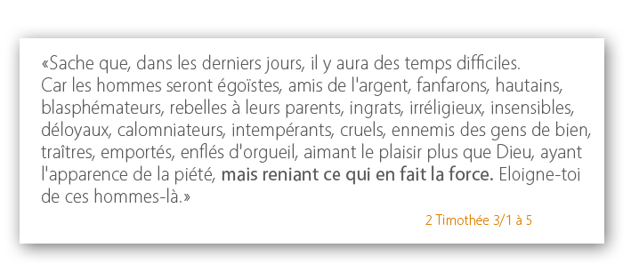 [1] 2 Timothée 3/1 à 5 : «Sache que, dans les derniers jours, il y aura des temps difficiles. Car les hommes seront égoïstes, amis de l’argent, fanfarons, hautains, blasphémateurs, rebelles à leurs parents, ingrats, irréligieux, insensibles, déloyaux, calomniateurs, intempérants, cruels, ennemis des gens de bien, traîtres, emportés, enflés d’orgueil, aimant le plaisir plus que Dieu, ayant l’apparence de la piété, mais reniant ce qui en fait la force. Eloigne-toi de ces hommes-là.»