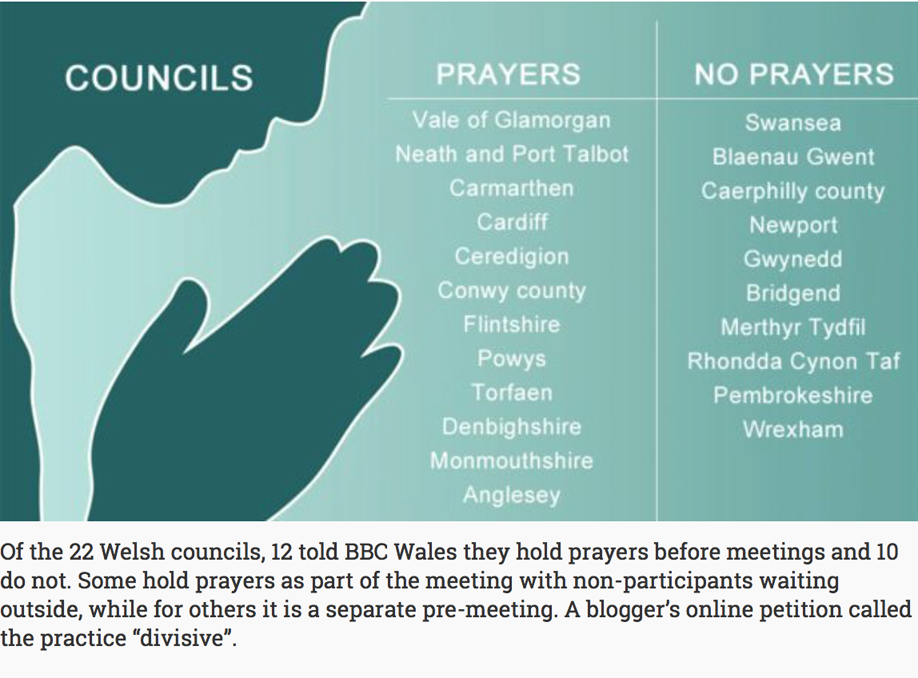 Il est important de savoir que contrairement en France, le thème des prières religieuses lors de l’ouverture de conseils communaux est une pratique répandue au Royaume-Uni, qui est tout à fait légale (vérifier ici). Régulièrement, des démarches sont faites pour tenter de mettre un terme à cette habitude traditionnellement chrétienne, sous la pression de la nouvelle religion de la laïcité. Cependant, il existe également une demande croissante — une revendication — des autres religions d’être intégrées dans cette pratique de prière, au nom de la diversité (article BBC). Dans l’illustration ci-dessous, on remarque que près de la moitié des villes du Pays de Galles ont choisi de prier une prière chrétienne lors des Conseils Municipaux.