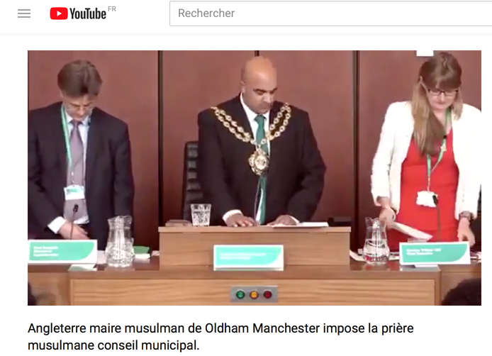 Une vidéo est proposée à la lecture, 2’20 (ici), montrant un extrait d’un conseil municipal de la ville d’Oldham, au Royaume Uni, lors d’une de ses séances du 12 juillet dernier, dont l’intégralité n’est en général pas proposée, puisqu’elle dure 3’28’40 (ici). On y voit un Conseil Municipal écouter religieusement la prière d’un imam, en début de séance, ce qui fait dire à ceux qui se prennent pour des lanceurs d’alerte : voilà ce qui nous pend au nez, à nous les français !