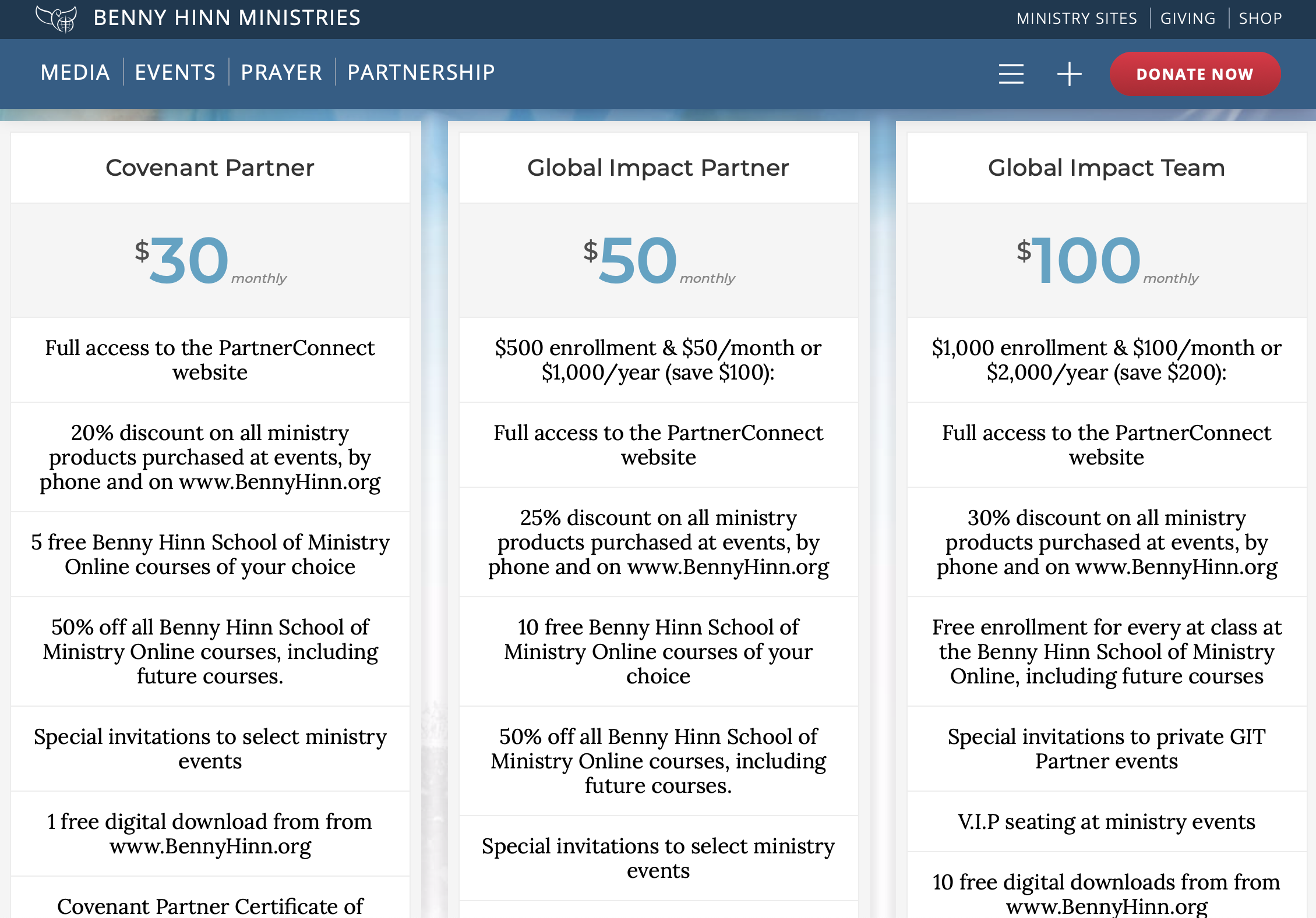 « Donner à Dieu était le secret pour déverrouiller les rêves », écrivait Costi Hinn. « C’était le secret pour l’avancement professionnel. C’était l’accès à notre compte en banque divin. Mon oncle m’a souvent raconté comment il s’est libéré de ses dettes en utilisant ce système de croyances. Son beau-père lui avait dit que pour se libérer de ses dettes, il devait honorer Dieu. Benny a expliqué qu’une fois qu’il a commencé à vider son compte bancaire et à donner de l’argent au ministère, l’argent a commencé à arriver de partout ! »